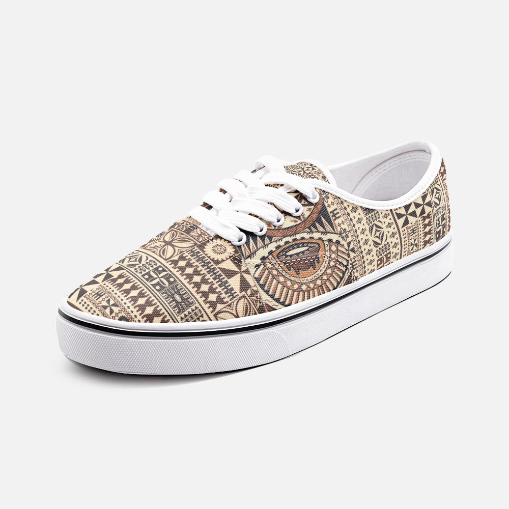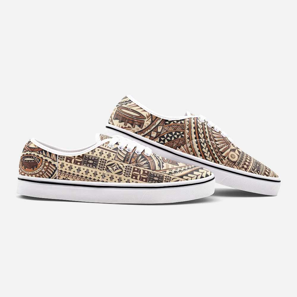 Tāpā is a tribute to traditional Samoan tāpā cloth — a cultural treasure often presented during special occasions to show honor, love, and respect. Every pattern tells a story, carrying family, tradition, and the kind of pride that gets passed down, not posted. This design brings that same energy into an everyday sneaker, with rich, woven-style details and warm island tones. It’s made for the moments that matter — weddings, graduations, church, family gatherings, or just a regular day when you still want to represent. Culture doesn’t have to sit on a wall to be meaningful — it can walk with you.